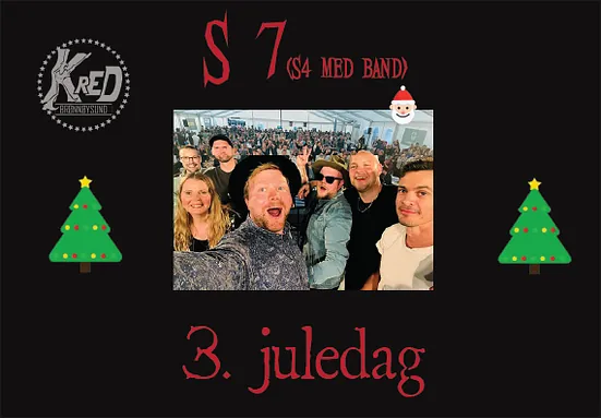 S7 (S4 med band) - 3. juledag, kl. 22.00 20/05/2025S7 (S4 med band) - 3. juledag, kl. 22.00Les merKred drar til på 3. juledag denne julen og serverer vårt partyorkester nr. 1, S7.