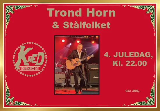 Trond Horn & Stålfolket - 4. juledag, kl. 22.00 20/05/2025Trond Horn & Stålfolket - 4. juledag, kl. 22.00Les mer4. juledag blir det nok en gang nostalgiaften på Kred med Trond Horn & Stålfolket. Her blir det gjenhør med kjente og kjære melodier fra Johnny Cash, Hans Rotmo, Highwaymen og mange flere, pluss at det skulle ligge an til en sang eller to av K.M. Myrland også. Det loves også nye låter inn i nostalgikvelden.